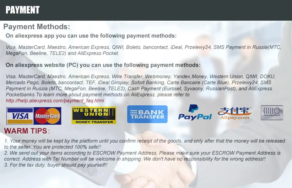 Payment issues: When you do not know how to pay, or pay encounter problems, please visit: http://activities.aliexpress.com/adcms/help-aliexpress-com/pay_order.php